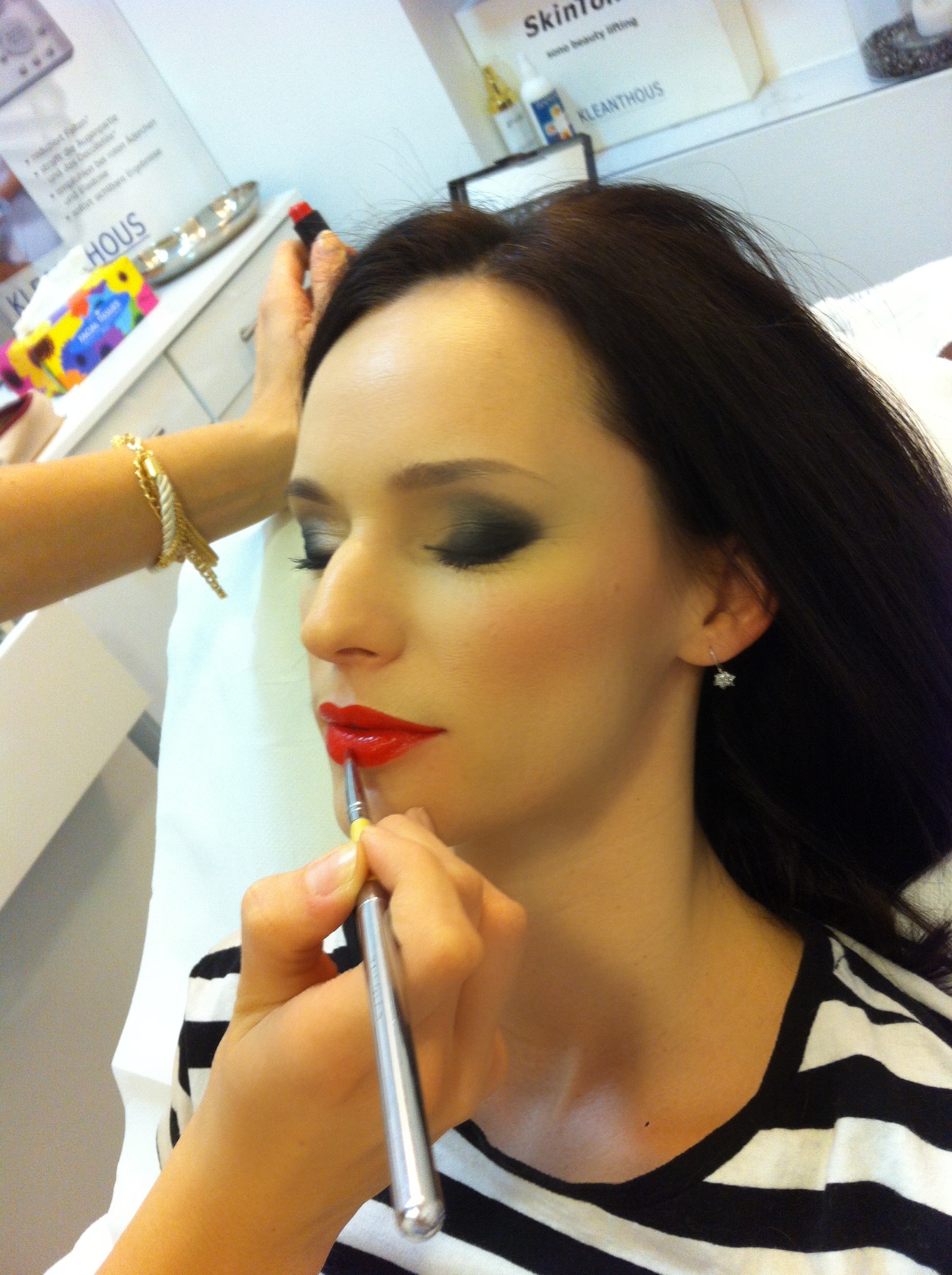 A frizura előtt irány a sminkszoba, ahol már vár Stefi. Alkalmi sminkünk legyen jóval erősebb, mint a megszokott. Egy nagyon szép, egyenletes, szinte láthatatlan, könnyű alapozás után, ami minden apró bőrhibát eltüntet, jöhet a szem hangsúlyozása. Füstös szemek, akár tusvonal, ami szintén jól mutat, és a már elkészült szempillák is még pluszba kiemelik a szemeket. A pirosító is lehet erősebb, valamint a rúzs is, amely az esetemben – ahogy már említettem – piros. Egy-egy ilyen különleges alkalomra érdemes profira bízni a sminket is, Csorba Stefánia ebben van a vendégek segítségére. Csakis igazán jó minőségű professzionális sminkmárkákkal dolgozik, mint a Mac, a Paris Berlin vagy a Kryolan. Ezek után nem fér kétség a sminkem tartósságához, biztos vagyok benne, hogy bírni fogja egész éjjel, és nem fog szétfolyni, csomósodni…