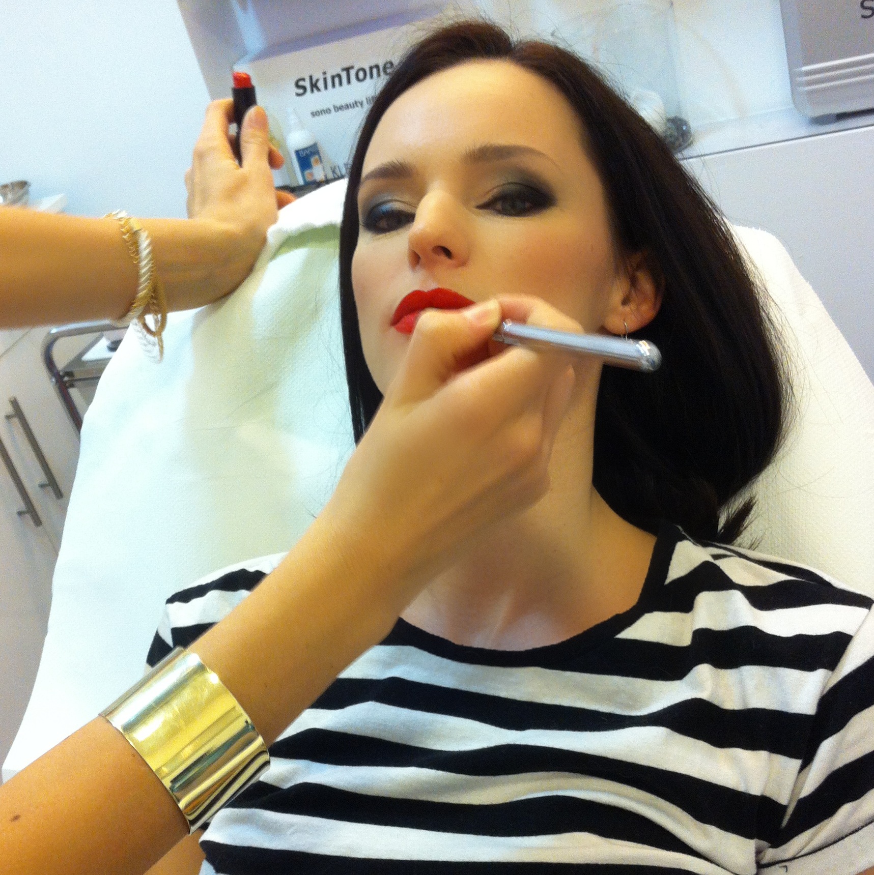 A frizura előtt irány a sminkszoba, ahol már vár Stefi. Alkalmi sminkünk legyen jóval erősebb, mint a megszokott. Egy nagyon szép, egyenletes, szinte láthatatlan, könnyű alapozás után, ami minden apró bőrhibát eltüntet, jöhet a szem hangsúlyozása. Füstös szemek, akár tusvonal, ami szintén jól mutat, és a már elkészült szempillák is még pluszba kiemelik a szemeket. A pirosító is lehet erősebb, valamint a rúzs is, amely az esetemben – ahogy már említettem – piros. Egy-egy ilyen különleges alkalomra érdemes profira bízni a sminket is, Csorba Stefánia ebben van a vendégek segítségére. Csakis igazán jó minőségű professzionális sminkmárkákkal dolgozik, mint a Mac, a Paris Berlin vagy a Kryolan. Ezek után nem fér kétség a sminkem tartósságához, biztos vagyok benne, hogy bírni fogja egész éjjel, és nem fog szétfolyni, csomósodni…