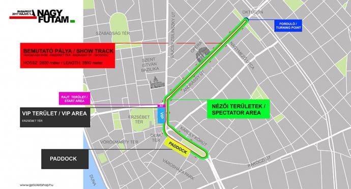 Ismertette, hogy a Városháza park lesz a paddock, ami már a Nagy Futam előtti napon, április 30-án látogatható lesz, s már ekkor meg lehet nézni a másnapi esemény autóit. Az autók a Károly körút, Bajcsy-Zsilinszky út, Andrássy út, Oktogon, Opera, Bajcsy-Zsilinszky út, Károly körút útvonalon fognak haladni május 1-jén. A délelőtti program 10 órától 12.50-ig, míg a délutáni 14 órától 16.20-ig fog tartani.