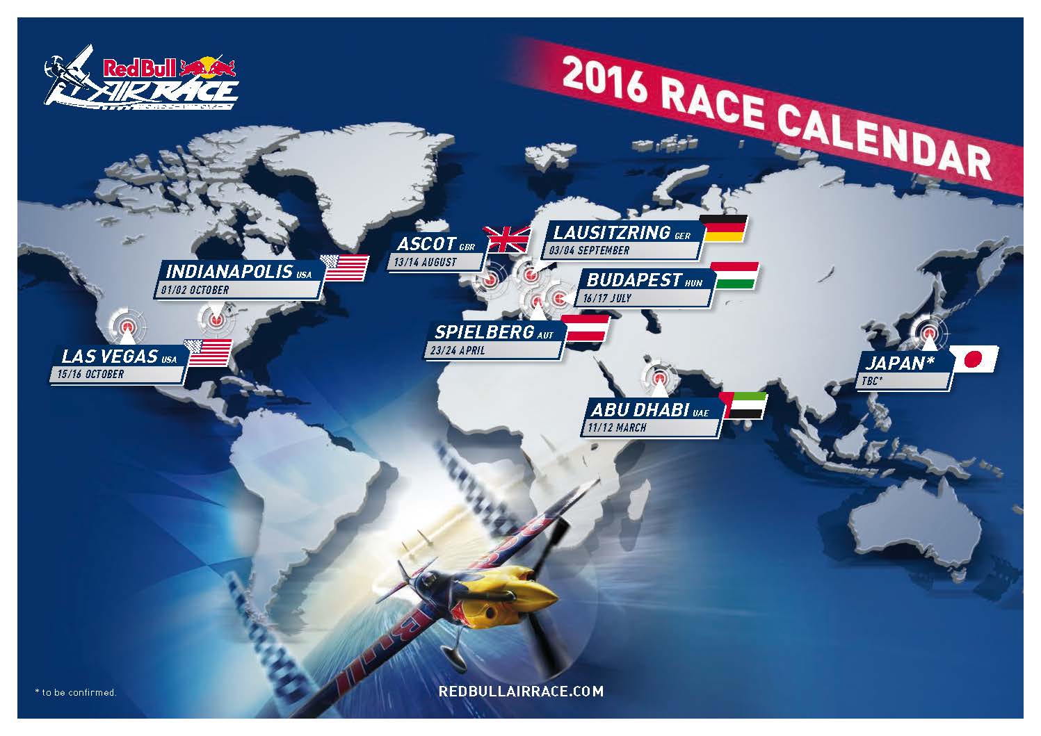 2016-ban a Red Bull Air Race Világbajnokság mezőnye újra hazánkba látogat, ahol a versenyzők a Parlament épülete előtt szállnak versenybe a másodpercekért. A kezdetek óta népszerű helyszínnek számító Budapest mellett a versenysorozat két új, izgalmas állomással bővül: a kilencedik szezonban a pilóták visszatérnek egy híres német autóverseny-pályára, a Lausitzringre, illetve most először mérhetik össze tudásukat az indianapolisibeli Motors Speedway felett.